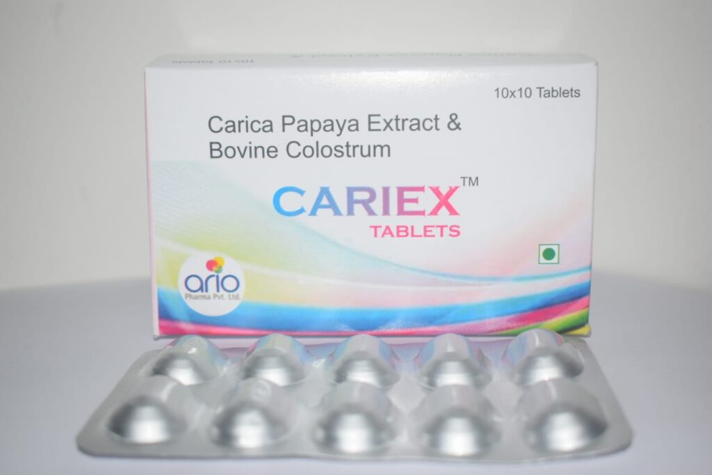 Cariex Tablets is a combination of Carica Papaya extract and Bovine Colostrum. It is used in the treatment of Dengue, Malaria and Acute viral Fever.