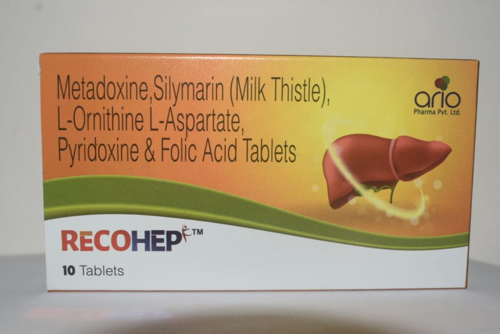 Recohep Tablets is a combination of three medicines: Metadoxine + Silymarin + L-Ornithine L-Aspartate + Vitamin B6 + Pyridoxine + Folic Acid